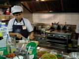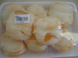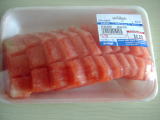 カルフールのフルーツ売り場の隣には左下写真のような惣菜売場があり、ここでカーオ(ご飯)と鶏のラープを購入。ラープはイサーン(タイ東北)地方の料理で、ムー(豚)やガイ(鶏)を生の唐辛子と香草で合わせた料理。超激辛。この鶏肉には火が入っているが肉にも火が入っていないものもあるらしい←タイは衛生観念がしっかりしていないので生肉には要注意。右上に付いているのは生キャベツ。あまりに辛い時は、この生野菜を少し食べれば不思議と辛味が和らぐ。ちなみに水を飲むのは余計に辛味を強く感じてしまうので逆効果。それでも水を飲んでしまう私。 |