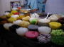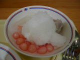 実は昼、夜とデザートも食べた。この手の店の前には色々な種類の素材が置いてあって、それを何個か選択し上からシロップと山盛りの氷がのる物。左は2種類。タプティムとは慈姑(くわい)に粉を付けて色水に漬けて茹でたもの。周りはゼリー状で中はサクサク。タロとはタロイモ。右は3種類。一![]() |
