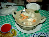 日本に「ジャイカ(JICA)」という団体があるのをご存知だろうか。日本の工業技術などを、タイなどのいわゆる発展途上国の人たちが学べるように支援している団体である。今回、私と同じくしてタイに渡った日本人の中に、ジャイカでタイと関ってきた方がいて、そのタイでの歓迎会に招かれ行った。 右のムーパッペットは豚肉をマクアプロ(丸なす)やマクアプゥワング(スズメナスビ)、プリック(唐辛子)らの野菜と供に炒め、ココナッツミルクで煮てあるもの。(4月10日) |