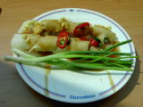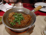 クンオップウンセンのオップとは、蓋付の鍋を使って少ない水分で加熱する調理法。蒸し煮(braiser・ブレゼ)と同様。鍋にねぎ、生姜などを入れ、春雨を加えて、シーズニングソースやオイスターソースで味付けし海老を入れて蒸し煮にしたもの。パクチー(中国パセリ)とにんにくの辛いたれが付いていて、これを適量春雨とあわせると、美味。写真には隠れているが、この春雨の下にはビッグサイズの海老がゴロゴロ4〜5尾入っていた。これ一品で210バーツ(≒651円)。 |