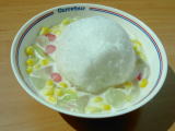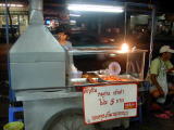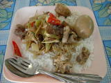 昼、スクムビット通りsoi29の屋台食堂といった感じの店で。総称カーオケーンと呼ばれるおかず乗せご飯。おばちゃん(店員)に食べたいおかずを言うとそれをご飯の上に乗せてくれるシステム。今回の物は鶏の内臓野菜炒めとゆで卵。ゆで卵は殻を向いた後、甘しょっぱい液体に漬けて味を染み込ませてある物。結構甘かった。そしてかなり作成後時間も経っていたみたいで、黄身が紫かがっていた。少し気味悪。(4月9日) |