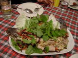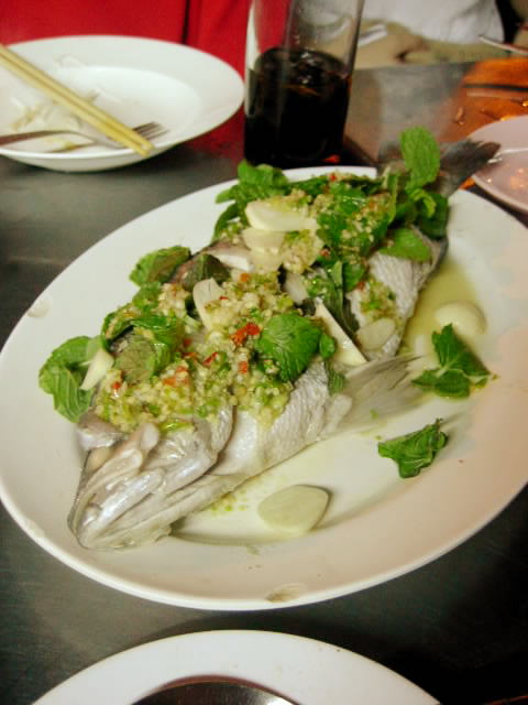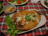 ムーマーオは脂身の多い部位(バラ肉?)を素揚げして、生の野菜などでライム和えした料理。脂っこいのかと思いきや、ライムのさわやかさと、上にのっているホーラーパー(スィートバジル)でさわやかに食べれる。美味。プラーローリーディートディアウーは川魚を観音開きにして揚げた料理。この魚の種類は解らなかったが、川魚特有の癖は無く、あっさりしていた。これも専用の甘酸っぱいたれに漬けて食べる。 |
