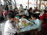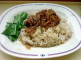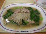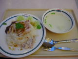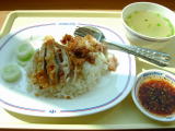 BTS(スカイトレイン)、オンヌット駅に隣接しているデパート「Lotus」の中にあるフードセンターにて。バンコクのデパートにも大体このようなフードセンターが付いている。ただ日本と違うのはクーポン制であるということ。料理を作っている人が非衛生的なお金を触れずに済むようにという事と、店舗のテナント費を確実に回収するためとの事。食べたのは定番「カオマンガイ」大盛。鶏のスープも付いている。タイ料理には珍しくスープ付の料理。鶏のスープで炊いたご飯にのっている。辛くないし、日本人に馴染み易い一品。私の好物。(4月4日) |