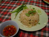 カオパッとは焼飯のこと。ガイが鶏でプーは蟹。タイ米で作ると非常にパラパラ。日本米で作るとべちゃべちゃしてこうも上手には仕上がるまい。供にプリック入りのナンプラーが添えられていて、各自で好みの塩味に仕上げる。基本的にタイ料理は食卓に出て来る料理は薄味。このようにして食べる人が好みで味を付ける。 |