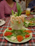 ガイナントートは名前のごとく鶏の唐揚げ。ただ、唐揚げの上にはホムディェン(タイのエシャロット)のフライがふりかかっていた。添えてあるのはパクチー(中国パセリ)、キュウリ。 クンケーコーはとても盛り付けのきれいな料理だった。甘酢のたれにボイルした海老を漬けて食べる。グラスには生野菜が添えられていて、それと供に食べる。 |
