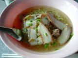 近所の屋台にて。昼は揚げ麺だったので、夜は汁ありのバーミー(太麺)で。かなりの薄味で、卓上にある調味料セット(クアンプゥング)で味付け。ナンプラーと砂糖と粉末唐辛子(プリックポン)を適量入れて食べたら、美味しかった。 |