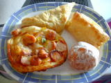 不覚にも体調を崩しかけた。この暑さと新しい環境にやられたのだと思う。もうこの際は思いっきり食事と水分を取って、汗をかいて寝よう!と決意。刺激の強い辛いタイ料理を控えて今日はおとなしくパンと野菜ジュースとフルーツで。タイに来る直前「タイはパンがおいしいらしい…」という未確認情報があったので確かめてみた。んー、普通。日本の菓子パンと大して変わらない。ただ、この気候で保存をよくするためであろう、保存料等の薬品臭いにおいはバリバリした。野菜ジュースは日本の緑黄色野菜ジュースと違い、本当に野菜成分が多く、果汁の多い日本のものと違いちょっと苦かった。(4月6日) |