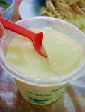 豆腐がタイでも存在しているのは何度か紹介をしているが、新たな豆腐料理を発見。豆乳でもない、ミルクでもない、その中間といった感じのデザート。 中は寒天かゼラチンで固めてあった。どこかで食べた事がある味だなーと思って食べていたのだが、食べ終わってから気が付いた。「牛乳プリンに似ている」。しかし、名前にもあるように、豆腐の香りもしっかりとしていて「牛乳プリン」その物とは違う。もしかしたらフランス菓子にあるブランマンジェの豆腐版という形容の仕方が一番近いかも知れない。タイのデザートらしからぬ(?)デザートであった。 |