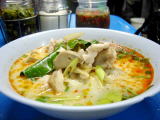 クイッティアオ(麺)はタイで大まかに4種類存在している。「バミー」と呼ばれる黄色い中華麺、「センミー」は極細米麺、「センレック」は細米麺、そして「センヤイ」は太米麺である。私はいつもここで"米麺''という表現を使っているが、これはつまりビーフンの事である。日本人は「ビーフン」と聞くと少し違う料理のイメージに捉えてしまいがちなので敢えて「米麺」という表現を使っている。この麺の名前の後に「汁有り」との意味がある「ナーム(水)」を付けるといわゆるラーメンになる。逆に汁無しと言う意味の「ヘン(本来は”乾く''との意味)」という言葉を付けると汁無しそばになる。どのクイッティアオ料理でもだいたい味は薄めで店からは提供されるので、卓上で右写真の調味料セットを使い、自分好みの味にするのがタイ人流。 よくタイ料理本を見ると「クイッティアオ・ナーム」と料理名が記載されている事があるが、この名前を屋台の店員に言っても「は? で、何にするの?」と例外なく聞き返される。(7月28日) |