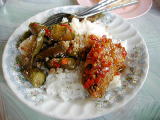 カオケーンには店によって色々な種類のおかずがある。また、そのおかずの種類も毎日日替わりで多種類出ていて、見ているだけでどれを食べようと迷うときがある。今日のメニューはプラートゥー(鯵のような魚)のサームロット(9月4日紹介)とナスの唐辛子炒め。ナスは元々スポンジの様な野菜で油を使えば大量に油を吸う野菜。その為、この炒めるときに使う油が辛ければ、当然ナスはとても辛くなる。豚挽肉と共に唐辛子で炒めてあるため、この料理のナスは見た目以上に辛い。タイ料理でのナスは注意が必要である。 カオマンガイ、毎月1度は食べているメニュー。今回のカオマンガイは私が初めてタイに来た時にタイ人の知人に連れられ行った店である。今日の夜、再びその時の知人とここで待ち合わせをした。本当にここのカオマンガイは少し値段が高いものの本当に美味しい。この店でカオマンガイを食べるのは既に4回目。場所はスクムビット通りsoi55(ソイ・トンロー)。 |