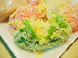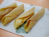 タイ菓子には何処か中国菓子の雰囲気もあれば、和菓子の雰囲気をもつ菓子もある。豆や米を原料として使った菓子が多いのは西洋菓子との大きな違いであるような気がする。そこの国々の食文化によってやはり菓子も色々と存在している。タイ菓子の大きな特徴といえばやはり大量のココナッツが使われることであろうか。特に海に接しているタイ南部地方には特にココナッツが多く使われている料理が多い。 このお菓子、餅のような生地に包まれているのは餡ではなくてココナッツと豆。甘みが無く、そのまま食べても美味しくは無い。一緒に添えられている砂糖を大量に付けて食べると甘くなって美味しい。タイの砂糖は精度がそこまで良くないので粒が大きく、口に入れるとジワッと広がる甘さである。(9月5日) |