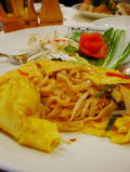 ここの店はブリティッシュパブではあるが料理はタイ料理も提供している。ここの店でのオススメはパッタイ。卵に包まれ「カイヤッサイ(卵に野菜炒めを包んだ料理)」のように仕立ててある。取りあえず美味しい。通常、卵は麺を炒めるときに一緒に炒めて、いり卵状態なのであるが、このようにオムレツ状にするのアイデアが面白い。パッタイ自体の味もしっかりとしている。屋台で食べるパッタイとはまたちょっと雰囲気の違う物であった。 |