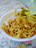 タイ人たちと一緒に昼食を取った。アルバイト先の賄いで用意されたのはこのクイッティアオ。麺が日本の「葛きり」や「マロニー」みたいな麺で透明であった。「なるべく辛くないの頂戴」と言ったのであったが、予想通り激辛。 麺だけを食べるので必死でスープまではちょっと… 強烈な辛さと強烈な酸味のスープは、まさにタイ人好みの味。 |