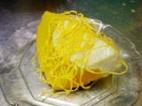 今週は語学学校が休みの為、特別にアルバイトをしていて、ご飯は外で食べずにタイ人と共にその仕事場で食べていることが多い。クイッティアオや、ガイヤーンやソムタムなどなどがそのメニューとして多く出ている。ご飯だけでなくタイのお菓子も色々と持ち込んでは皆で食べている。 そのお菓子の中から2つ。 カノムソッサイはココナッツの白い果肉を削り、甘く団子状にしたものをココナッツミルクで固めてバナナの葉で包んだもの。一つ一つ丁寧に包まっていているのだが、とても安い。相場は大体2〜3バーツ/個。軽く塩味がついているのが特徴。 サンカヤーファクトーンはカボチャの種のある部分をくり抜き、そこにタイ独自のプリン生地を流し込んで蒸かした物。もぅ〜、甘党の私にはとてつもなく美味く感動の一品。ただのカボチャがこのようにして食べるとこんなにも美味しくなるものかと正直思う。上にかかっている黄色の物体は日本で言うところの「鶏卵素麺」。タイ語ではフォイ・トングと言い、甘い錦糸玉子である。(10月17日) |
