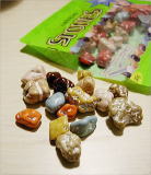 タイ料理ではない。 ここに載せるべきではないかも知れないが、面白かったので掲載決定。 ただのチョコレート菓子である。ただ、形が面白く、全て石のような形である。普通に置いてあったら本物の石と見間違えてもおかしくない様なものである。 袋の後ろを見るとハングル文字の記載が有り、どうやら元々は韓国のお菓子。それをタイが輸入してして発売しているらしい。同様に中国語での表記もあり、中国でも販売しているようである。 味には別段これと言って特徴は無いが、それにしてもこの形はやっぱり面白い。 |