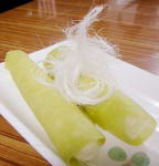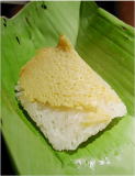 バイトーン(バナナの葉)に包まっているご飯はカオニィアオ(もち米)を甘く炊いたもの、その上に乗っているのはいわゆる蒸しプリン。日本語名はなんとも付け難かったので今回は無しにした。「サンカヤー・ファクトーン」と言うカボチャの中にこのサンカヤー(プリン)をつめて蒸したものも以前に紹介したことがあるが、まさにそれのカオニィアオ版。朝から昼にかけて、売られていることが多くタイ人はこれをちょっとした間食として食べることが多いようである。ちょっと安っぽいが、私は大好きなタイ菓子の一つ。(11月10日) |