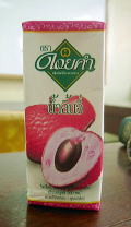 ネタに行き詰ったときの飲み物シリーズ…(あっ、バラしてしまった!!) チャーサオワロット。「チャー」は中国語・日本語と同じように「茶」のこと。「サオワロット」は辞書を引くと『蔓生植物の一種』としか書いていないが、この飲み物のパッケージから推測するに、パッションフルーツのことであろうと思う。早速飲んで見ると、まさにパッションフルーツティー。パッションフルーツ自体もともと酸味は強いものであるので、紅茶との相性はかなり良い。グットです。 もう一つの方は「ナム・リンチー」。リンチーは中国語からの派生語で日本語の「ライチ」。まっ、兎にも角にも美味しいですね。リンチーは。 |