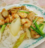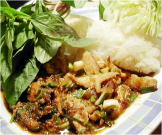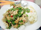 カオケーンにて左記の2品をご飯に乗せて食べた。「ペッ(辛い!)」けれど「アロイ!(ウマイ!)」。ちょっとこれだけでは物足りなかったので、目玉焼き(5バーツ)だけを別に注文して食べた。 今日、最新の日本の某料理雑誌を見ていたら、とある東京の人気レストランがタイのガパオ炒め(バジル炒め)をメニューに載せていた。タイでは当然の目玉焼き添え。ところが日本ではこのスタイルが斬新だったらしく、かなりの好評らしい。記事には、「タイのガパオ炒めに目玉焼きを乗せてここの店風にアレンジ」と書いてあったが、ガパオ炒めに目玉焼きを乗せるのは殆どのタイ人常識。別に特別なアレンジではない気がするのだが… |