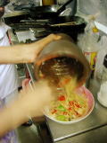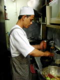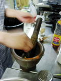今日はとことん「ソムタム」特集!! 私は現在、とある店で短時間であるがアルバイトをさせてもらっている。内容は日本人ビジネスマンを対象としたランチ営業のみのレストラン。作っている料理は和洋中様々である。スタッフは全員タイ人という中にポツンと日本人一人が入って、そこまで偉そうな事はしていないが、日本人の作る料理をタイ人に教えている。 今日は学校が休みだったので、朝から夜近くまで店にいた。14:00過ぎ、賄い時間になりタイ人のスタッフは自分たちのご飯を作り始めた。勿論自分たちのご飯はタイ料理。今日のメニューは「ソムタム」。いつもは料理を試作&作りながら教えている私であるが、この時ばかりは攻守交替とばかりに、逆にソムタムを教えてもらった。 スタッフはほぼ全員がイサーン(タイ東北)地方の出身者で、いわばソムタムは郷土料理。「イサーン人であればどんな人でも作る事の出来る料理だよ」とはあるスタッフ談。 作る際に必要な調理器具は「クロック・サーク」と呼ばれるタイ独自の臼杵と包丁1本のみ。クロック(臼)には煉瓦製、木製、石製のものがあるが、ソムタムを作るときには必ず煉瓦か木を使う。石のクロックは香辛料を潰してカレーペーストを作るときに使うぐらいで、一般家庭に間違いなくあるのは煉瓦か木である。ちなみに写真は煉瓦、私が先日、日本に持って帰った物も煉瓦である。 作り方はいたって簡単。今回私に作ってくれた「ソムタム・タイ」に入っていた材料は以下の通り(入れた順番→あまり関係ないが…)。 プリッキーヌー(激辛唐辛子)、ニンニク、トマト、マナオ(ライム)、砂糖、チューロット(味の素)、ナンプラー、マクア・ポ(タイ独特のなす)、マラコー(青パパイヤ)、ピーナッツの粉末。 今回は無かったので入っていないが、小エビを乾燥させたものやサヤインゲンが入っても良い。分量は全て適量。辛くしたければ、プリック(唐辛子)を多く、甘くしたければ砂糖を多くといった感じで、皆それぞれ自分好みの味に仕上げていた。作り方は簡単。全てクロックに入れてサーク(杵)で叩くだけ。以上。 私はちょっとへタレだったのでプリッキーヌーを1本だけにして作った。美味しかったが、やはりある程度辛い。 タイ人たちは、この数倍以上の辛さのソムタムを隣でぺろりと食べていた。(11月9日) |