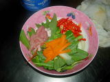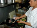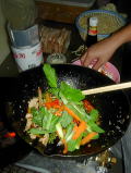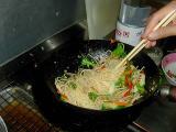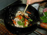 5, 最後に残っている野菜を全て入れる。 今回は入れなかったが、キャベツを入れてもいいそうである。 ガパオは大量。 6, ちょっと今回は訳ありで、麺がスパゲッティになっているが、 元々はセンヤイ(米太麺)やそのままご飯と共にといった感じで 食べられるものである。 |