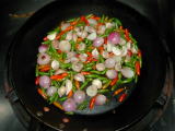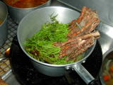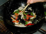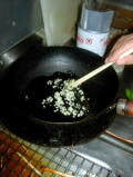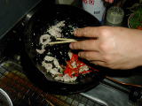 2, ニンニクが色づく前に豚肉を入れ、 白くなりかけたら唐辛子を入れる 3, コショウの実を枝ごと入れる。 この実は乾燥していない生で、食べるものではない。 香り付けの為のもの。 |