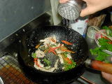 4, 調味料を入れる。 塩、化学調味料(味の素)、オイスターソース、 シーユーカオ(タイの白醤油)。 |