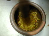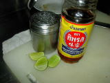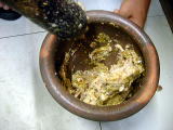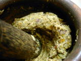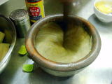 6、しっかりとしたペースト状になったら、タイ料理、3種の神器で味を付ける。ナンプラー、マナオ(ライム)、そしてポンチューロット=味の素。この時点で一度味見をしたが、唐辛子の色が見えないだけで、激辛。美味しい事は美味しいが、直後に襲ってきた辛さは凄かった。 |