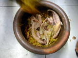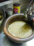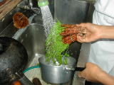 7、鯵に味が付いたら、沸騰湯を一気に注ぎいれる。「何故、お湯?」と聞いたら、「菌を殺すため」と教えてくれた。本当はタイ人もやっぱり腹痛を起こしたくないらしい… この時点で再び味見。やっぱり辛い。 |