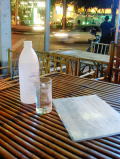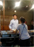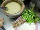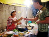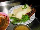 10、ナンプリックパオブラトゥーと食べるのは何もサダオだけではなく、生野菜なんでもOK。皿に乗っているのは、キュウリと茹で筍。 私は一口食べるたびに、氷水を飲んでしまっていたが、タイ人曰く「お腹に良くないからあまり飲まない方が良い」とのこと。「お湯の方がいいよ」と言ってくれたのは一緒に食べていたタイ人。辛い料理にお湯。絶対に嫌です… タイ人たちも、一応辛いとは感じているのだそうなのだが、それでも水も飲まずに食べ続けていた。私の舌のタイ化にはまだ時間がかかりそう…(12月10日) |