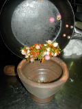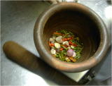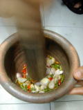 2.フライパンに大量のプリッ・キー・ヌー(極辛唐辛子)とニンニク、ホムデン(エシャロット)をいれ、油も敷かずに焼く。ここでこれらには完全に火を通してしまう。ちなみにこの作業がパオ≠ナある。 3.2に完全に火が通ったら、クロック(臼)に入れる。別に冷ます必要は無い。サークとはクロックの隣に写っている杵のこと。クロックは土製でもサークは木製である。 |