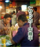 タイ料理の屋台には料理の種類を限る専門屋台と、注文を受けてから、有る材料で作る注文屋台、そしてこのカオケーン屋台がある。カオケーン屋台は既に調理されたタイ料理がそれぞれ料理別にバットに入っていて、お客は自分の食べたいものを店員に伝え、白ご飯の上に乗せてもらうというスタイルである。料理の種類は店によってまちまちだが、今日の店では20種ぐらいのタイ料理のおかずがズラッと並んでいた。場所はバンコクの中心地・シーロム、別名日本人通りとも呼ばれるタニヤ通り内。時間は19:00でちょうど食事時。近隣の人や仕事帰りの人、これから夜の仕事と思われるの人まで様々なタイ人がここで食事をしていた。 私が食べたのは次の2種類(カオケーンは一食で2種類食べるのが一般的)。左側のムー・パロー≠ヘ豚バラ肉を八角などの香辛料や醤油、砂糖などの調味料を使って柔らかくなるので煮込んだもの。右側のガイ・パッ・キン≠ヘ鶏肉の生姜炒め。唐辛子や野菜と共に炒めてある。美味しいー!! ここの屋台は代金を料理と引き換えに渡すというシステムであった。また、席 ![]() ちょうどこの時間は横浜で行われていたサッカーTOYOTA Cupの試合終了間際で、近くに置かれていたテレビの前では仕事中のはずのオバちゃんも試合中継に見入っていた。(12月3日) |