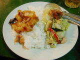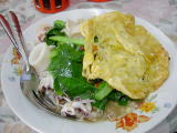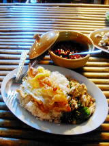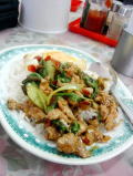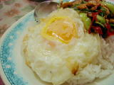 「カイダーオ=目玉焼」とはいってもタイの目玉焼は強火で一気に作るため、一般的に短時間では作らない日本の物とは違い、そう形の綺麗なものではない。 黄身は半熟で白身の端のところはカリッとしている事がタイのカイダーオは多いような気がする。 主のおかずは定番バジル炒め。ちょっと今日のガパオ(通称)は唐辛子が多くてなかなか刺激的だった。辛い、辛いと思いながらも同時に美味い、美味いと感じる事のできるタイ人にも人気の高い料理。タイ人はトムヤムクンなんかより、よっぽどこの料理を食べている回数の方が多いと思う。 |