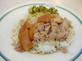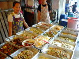 カオケーン屋台に行くと、色々なおかずが並んでいて、本当にどれを食べようか迷ってしまう時がある。 スープから、カレー、炒め物、サラダ(ヤム)、目玉焼きまで客はどの組み合わせでもOK。2種類をご飯の上に乗せてもらい今日も食べた。本日のメニューはゲーン・キィアオ・ワーン・ムー(豚肉のグリーンカレー)と、パッ・ウンセン(春雨炒め)。 お皿に乗せてその場で食べてもよし、ご飯の入った箱に乗せて詰めて持って帰ってもよし、袋におかずだけ入れて持って帰ってもよし。美味い、早い、安い、そして種類が豊富。タイ人はカオケーンが本当に大好きだと思う。(12月9日) |