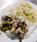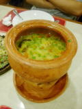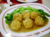スクムビットsoi55、トンローにあるタイ料理店。トンクルアンにて。 ここの店はトムヤムクンが写真のような陶器に入って出てくる。東南アジア独特のこの陶器は鍋の下に火を置く所があり、固形燃料を燃やして、鍋ごと温める事ができる。陶器なので、直接火を当てても問題ないのであるが、ただ若干のヒビでも陶器に入っていようものなら、鍋が温まるたびにピキッ、ピキッ≠ニイヤーな音が出る。前回ここで食事をした時がまさにそれで、ちょっと怖かった。その時は、結局燃料の火を消して事なきは得たが、ちょっと注意が必要。 プラームック(烏賊)ヤッ(詰める)サイ(芯)チィアン(魚を揚げて砂糖、酢などで味を付けたタイのおかず)と私の持っている辞書にはこう書いてあった。早い話が、烏賊の団子である。ただ団子の中に入っているすり身は魚と海老を使ったもので、それを烏賊で包んで衣をつけて揚げてあった。緑の野菜は青梗菜(チンゲンサイ)。チィアン≠ニいう言葉は元々中国語であるからして、中国から伝来した料理であろう。 |