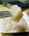 タイの東部にウボン・ラチャタニーという都市がある。このお菓子はここで作られたものであるとパッケージに書いてあった。 スーパーマーケットのタイ菓子コーナーにて購入。 上に乗っているのはマプラオ・クート(=ココナッツの果肉を削ったもの)である。カノム(お菓子)自体は粉の入った生地を蒸して作っている菓子で、モチッとした食感。ほのかにクルウェイ(バナナ)の香りがしていてとても美味しく食べる事ができた。砂糖の甘さもかなりあって、一度に食べないほうがいいなーと思ったが、「止められない止まらない」状態で結局数分で完食。(12月5日) |
