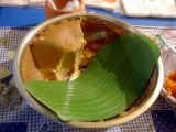 8、再度味を調えて完成。 この緑の葉はサダオと言う葉。このような魚系の料理と食されることの有る葉っぱで、サッと茹でて新芽の所を食用とする。はっきり言って超激苦。数回茹でこぼすと良いらしいが、今回は1回のみ茹でた。生食も可能とのことで、生の状態で一葉食べてみたら… …苦すぎ… ちなみにサダオはリン、ビタミンA、繊維質が豊富だそうである |