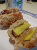“マオ”というタイ語は、「酔っ払う」という意味が有るが、「カオマオ」の“マオ”は音が違うので、意味も異なる。 ここの“マオ”は「熟れすぎの米」の事を指し、タイではこの米を搗いて煎餅等を作るようである。写真のお菓子は、甘く味付けした米の団子の中にバナナが入っているもの。3コで10バーツ(≒28円)とリーズナブル。かなり腹持ちも良い食べ物である。 チューチーとは、何か料理のタイ語名らしくない気がしたが、辞書を引いてみると「タイ料理の一種・チリソース和え」と確かに書いてある。チリソース和えというか、ほぼレットカレー煮込みといった感じの料理ではあった。プラートゥーはタイの魚であるが、日本の鯵とほぼ同じ魚(厳密には違うようだが…)。味もそう変わらない味で、白身はそこそこ美味しい魚である。(3月20日) |