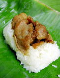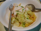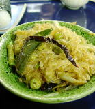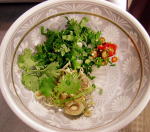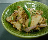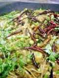 パットは「炒める」、ホは… これが、よく分からないのである。タイ人に聞いても「知らない」と返ってきた。 タイ北部の料理に「ゲーン・ホ」と言うカレーのような料理が有るが、これはそれではない。 と、言うわけでお手上げである。タイ人に分らなければ、調べようが無い。誰か、分る方、情報待っています…(かなり弱気…) 料理は春雨を辛く炒めてある料理。上にのっているのは油でカリッと揚がっている唐辛子。緑の葉っぱのようなものは、バイマックルーというこぶみかんの葉。そう、トムヤムクンに入っているあの葉っぱである。この葉っぱは硬いので食べれません。あしからず。(4月28日) |