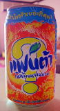 タイにも、ファンタが何種類かある。しかし、現在の日本にあるファンタと同じようなものは無い。 まず何がスゴイと言って、「色がスゴイ」。どれもバリバリの着色なのである。そして、甘い!! 日本には、缶に必ずと言うほど成分表示があるが、タイには有るものと無いものがある。このファンタは後者の為、果たしてこの一缶にどれくらいの砂糖が入っているかは不明であるが、かなり入っているのは間違いが無い。 写真左はオレンジのファンタ、右はイチゴのファンタ。この他にも、真っ青な色したベリーのファンタや、黄色い色したパイナップルのファンタもある。 この黄色いファンタは、これだけパイナップルがタダ同然の価格で溢れている国で、わざわざパイナップル味のファンタを作ったタイの化学技術に脱帽!! って感じのファンタである。 ちなみにファンタはタイ語では、「フェーン・ター」と発音する。(4月30日) |