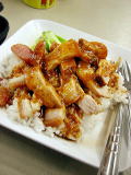 ご無沙汰してしまいました、屋台料理です。 屋台の軒先で、豚ばら肉が大きな塊のまま揚げてあるのをよく目にする。 今回は、その豚バラ肉を、適当にバンバンバンと切って、ご飯の上に乗せ、ソースを掛けただけの料理。 横には、何故か、生きゅうりと、ちょっと甘いソーセージが添えてある。 豚ばら肉だけでも結構なボリュームで食べ応え充分。 なんだか、豚肉が食べたいナーというときの、私の秘密の一品。(1月30日) |