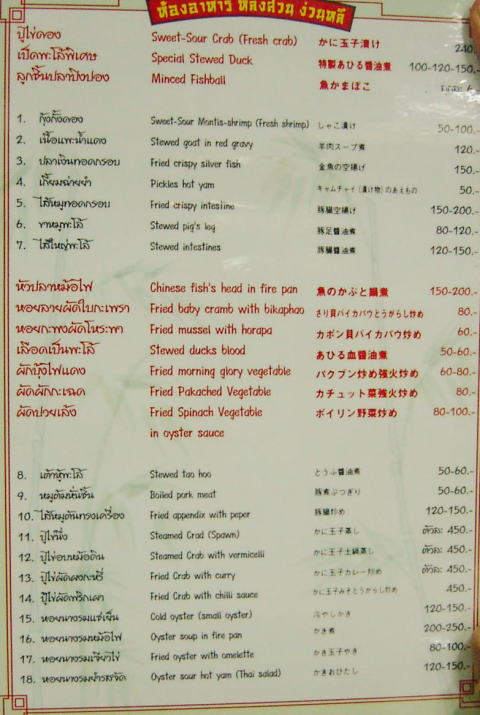 | 注文したことが無いので写真は無いです… → | いつも気になっているのであるが、No.3の“金魚の空揚げ”。タイ語を見ると、「プラー・グン・トート」と書いてあり、これは日本で言う「白魚」のことである。白魚と金魚じゃエライ違いであるのだが… 未だ注文するまでに気持ちが至らず。 |