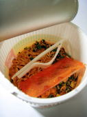 現在、タイ国内で発売中の、日清食品のカップヌードル。日本の発泡スチロールものとは違い容器はプラスチック製。 インスタント麺といえば、タイではその会社名がインスタント麺の代名詞となってしまっている「マー・マー」が有名で大きなシェアを占めているが、インスタント麺の元祖「日清食品」もタイに進出してきている。 タイで発売されているカップ麺には、どのメーカー品にも必ずといって良いほどカップの中に白いプラスチックで出来た「フォーク」が入っている。(右上・写真) 粉末スープは既に麺にからまっている状態で、このカップの中に入っていたオレンジの袋は調味油(「スパイシー・ゴマ油」≒「ラー油」)である。 お湯を注ぐと3分… ではなくてこのカップ麺は1分の待ち時間だけ。箱にも“バミー(麺)・クゥング(半分の状態)”と書いてあり、完全なインスタントではないことを示してある。ちなみに、箱に書いてある“サムレットループ”は「インスタント」、“ロット”は「味」という意味である。 ここでタイのインスタント麺に共通している事柄から、完全な私見なのであるが… 1, タイ人がインスタント麺を調理する際は、日本のように乾燥カヤクや粉末スープ・特殊調味料等色々と袋が入っていて、あえて調理している雰囲気になるのを面倒くさがる傾向が強い。質素で簡素がタイ人向け。 2, カップめんを自前の箸で食べるのは日本だけ? フォークが入っているとなんか、得した気分になる 3, お湯を注いで待ち時間が1分というのは、正にタイ人向け。 日本人みたいに3〜5分待つという事は、確かにタイでは非現実的か…。 (10月19日) |