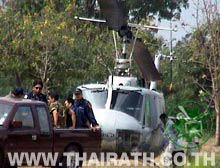 タイ軍のヘリコプターが13日朝、西部カンジャナブリ県の村の上空を旋回した後、寺の隣の草地に着陸した。