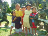 ブッタパーク内にはその名の通り石の仏像が沢山並んでいる。中心には超でっかい寝仏。その寝仏が見下ろすように色々な種類の仏像が並んでいる。ここが面白いのは、仏教の普通の仏像だけでなく、なぜかヒンズーのちょっとマニアック受けしそうな像がゴロゴロとしていること。決して広い公園ではないが、確かに一見の価値はある所である。 入口の入ってすぐの所にはカボチャ型の石室があり、この中に入ってみると、この中にも仏像が並んでいる。かぼちゃの天辺に登ることもでき、窮屈ながら(私が太いだけ! ?)登ると、上では袈裟をまとった小僧たちがいた。近所の普通の子供たちもこの中で遊んでいて、カメラを向けると照れくさそうに写真に収まってくれた。デジタルカメラが珍しいらしく、とった写真をすぐに見せると想像以上に喜んでくれる。ここで味を占めた私はこの旅行中、「撮ったら見せる作戦」で以後ラオスの子供たちを沢山カメラに収めることになる。その写真は順次。 ラオスの子供たち、純粋で本当に愛くるしく可愛いですよー!! |