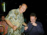 大晦日の夜、年が明ける直前に、ルアンパバーンの街の横を流れるメコン川の畔へ行った。ラオスの正月は4月のため、今日を年越しとして騒ぐ地元民はあまりいなかったが、対照的に外国人だけが集まって騒いでいるところがあったので潜入した。ラオス人の中にも騒ぐのが好きな人は、観光で来ている外国人と共に飲んで踊って騒いでいる。あるラオス人のオッちゃん(左写真)なんかはラオスの焼酎「ラオ・ラーオ」と一杯のグラスを片手に次から次へと外国人へ酒を飲ましている。このオッちゃん自身すでにかなりの酔っ払い。写真に写っているドイツ人結構ヤラレていた。どこの国でも、酔っ払いは酔っ払い。 新年の挨拶はラオス語で「サバイディー・ピー・マイ」。ラオス語、英語、フランス語で書かれた看板を何ヶ所かで目にした。 |