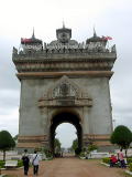 ラオスは旧フランスの植民地であった。しかし、ヴィエンチャンの街は、他のどの国の首都よりも確かに貧相である。ビルもないし、大きな道も今のところない。 そのラオスで最も大きな建物というのがこれである。 「パトゥーサイ」、パリの凱旋門をまねして、作り始めたのは50年ほど前なのであるが、まだ完全には完成していない。ガイドブックには、“パリの凱旋門よりはるかに小さい”と書いてあったが 決してそんなことは無く、決してひけをとらない大きさである。(実際パリの凱旋門もメチャメチャ大きいわけでもないと思う) 建物の中はフランスの西洋的なものとは違い、ここの物には、東洋的、仏教的な装飾が施されている。、 |