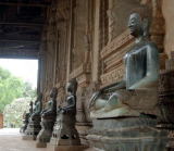 ヴィエンチャンの町の中心からちょっと離れた所に、「タートルアン」という寺がある。この寺は、ラオス全国の寺院の中心に位置している所で、、その偉大さを誇示するかのごとく、本堂は金色で塗り固められている。 タイにはワット・プラケーオ(エメラルド寺院)という寺が同じようにタイ全国の中心である寺だが、ここもまた同じである。 旧暦12月の満月の日にはタートルアン祭という祭りが行われているようで、金色の本堂が電飾され、日本ではあまり考えられない“ピッカピッカ”の寺になるそうだ。ちなみに同じ12月の満月の日、タイではローイクラトン(灯篭流し)が行われていて、両国にとってとても大切な日である。 本堂の周りは回廊になっていて、沢山の仏像が並んでいたる。 |